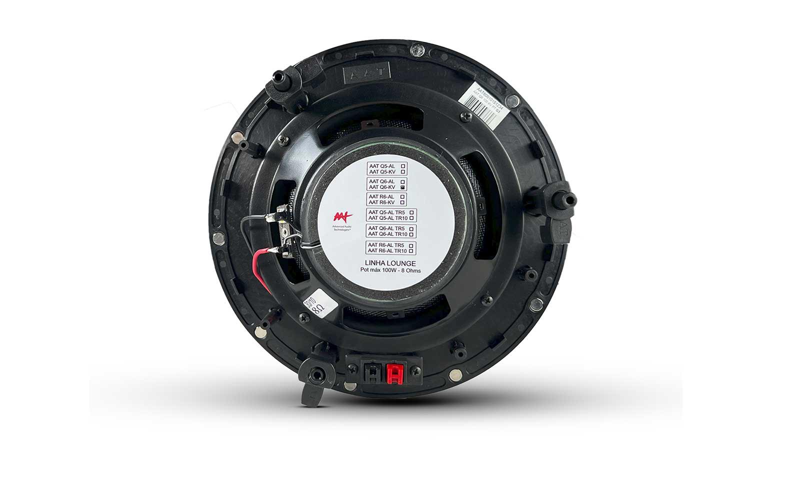 Com versões nas cores branco ou preto, a linha AAT Ambiente Lounge Q6 G3 é composta por quatro caixas acústicas de embutir. Os modelos de terceira geração oferecem tweeter pivotante (móvel) de 1 ¼ polegadas e woofer de 6 polegadas. Nas caixas AAT Q6-100KV G3, o woofer é de Kevlar, material de sonoridade excepcional. Já as AAT Q6-100AL G3 apresentam woofer aluminizado de polipropileno (PP).